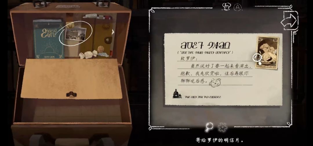 3️⃣拿到明信片后打开背包查看明信片,会发现明信片在包包夹层不在外层,如果查看明信片可在背面看到文字,那就是寄给罗伊的,之后在大剧院那里的红色邮简里寄出去即可完成✅