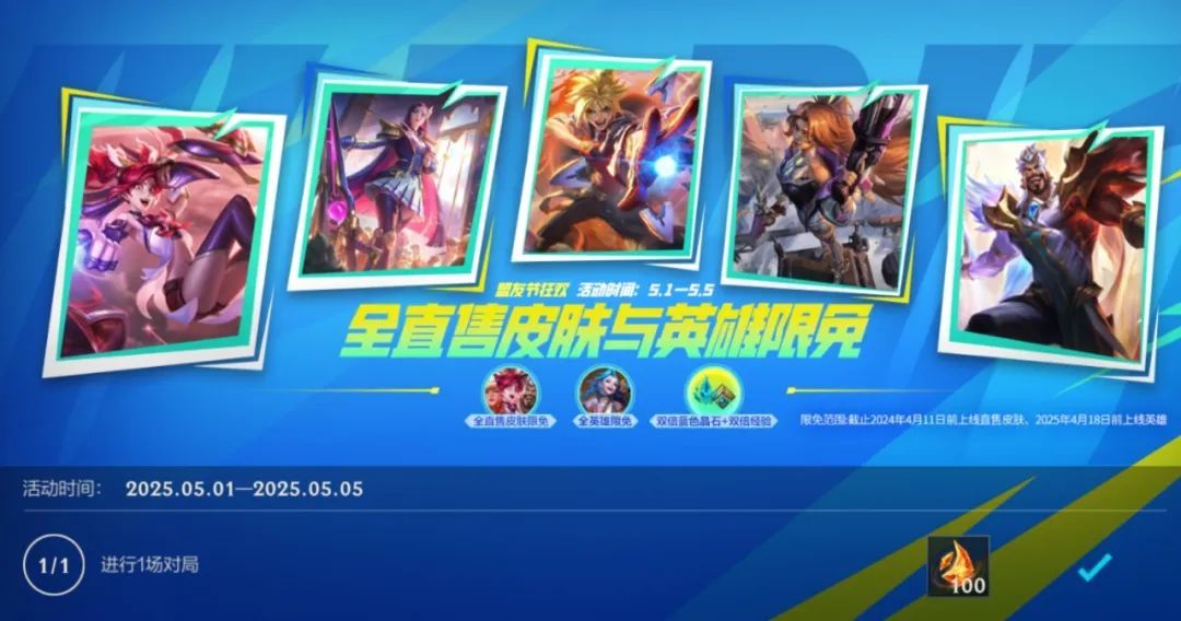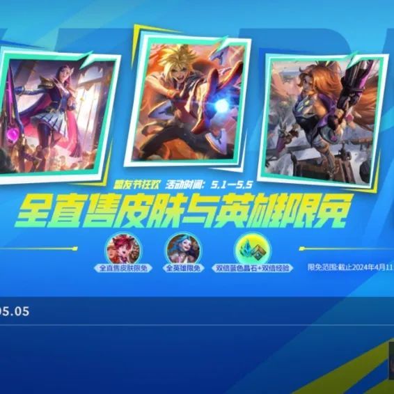即日起,截止至5月5日23:59,356个商城直售皮肤首次限免,全英雄限免、双倍蓝色晶石+双倍经验同步开启!此外,召唤师进行1场对局还可领取龙魂水晶*100好礼~