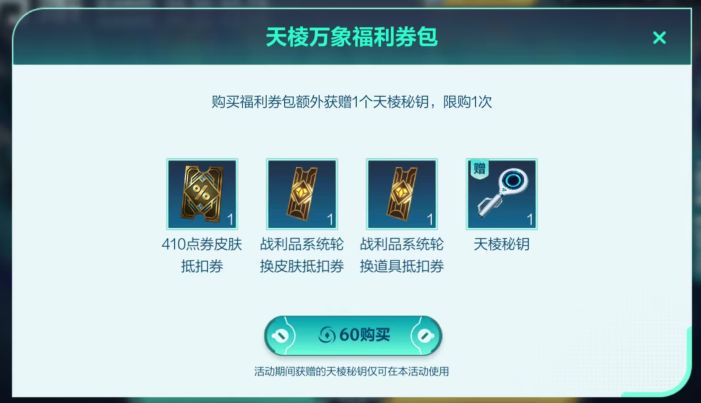截止至5月25日,召唤师花费60点券即可购买天棱万象福利券包,限购1次。礼包内包含410点券皮肤抵扣券*1、战利品系统轮换皮肤抵扣券*1、战利品系统轮换道具抵扣券*1、天棱秘钥*1。