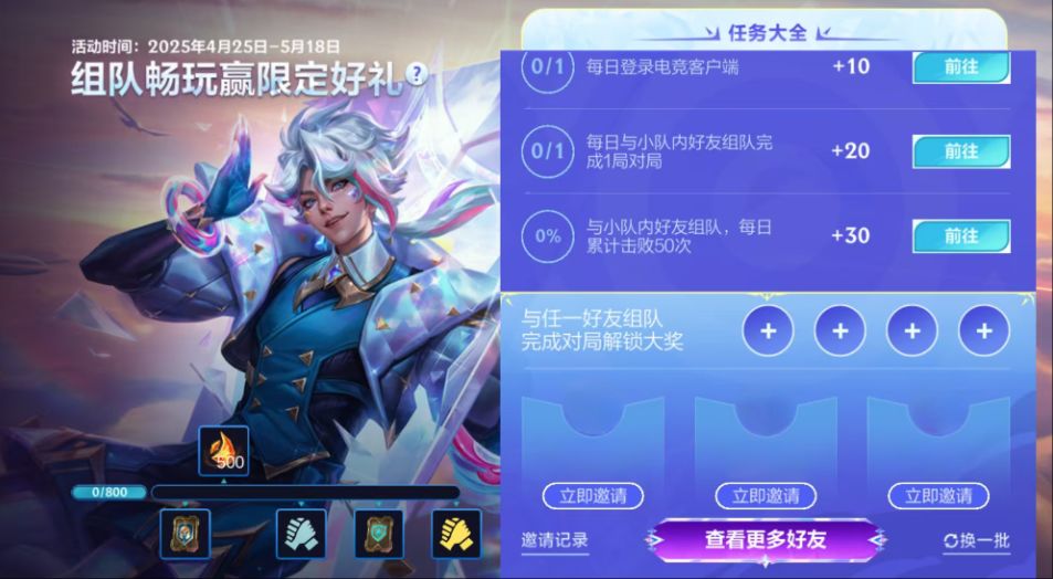 截止至5月18日,召唤师完成活动任务即可积攒活动积分,活动积分达到奖励目标后,即可领取S17英雄保分卡、龙魂水晶*500、称号-地表最强搭子、微型海克斯能量卡与称号-宇宙最强搭子奖励~