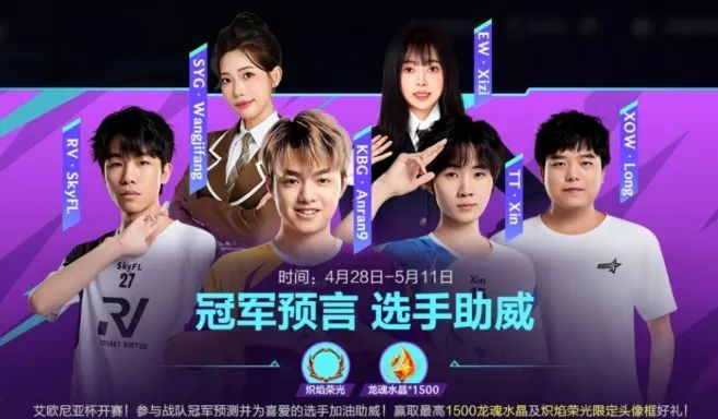 艾欧尼亚杯火热进行中!截止至5月11日,召唤师参与战队冠军预测并为喜爱的选手加油助威,即可领取最高龙魂水晶*1500及限定头像框-炽焰荣光好礼~