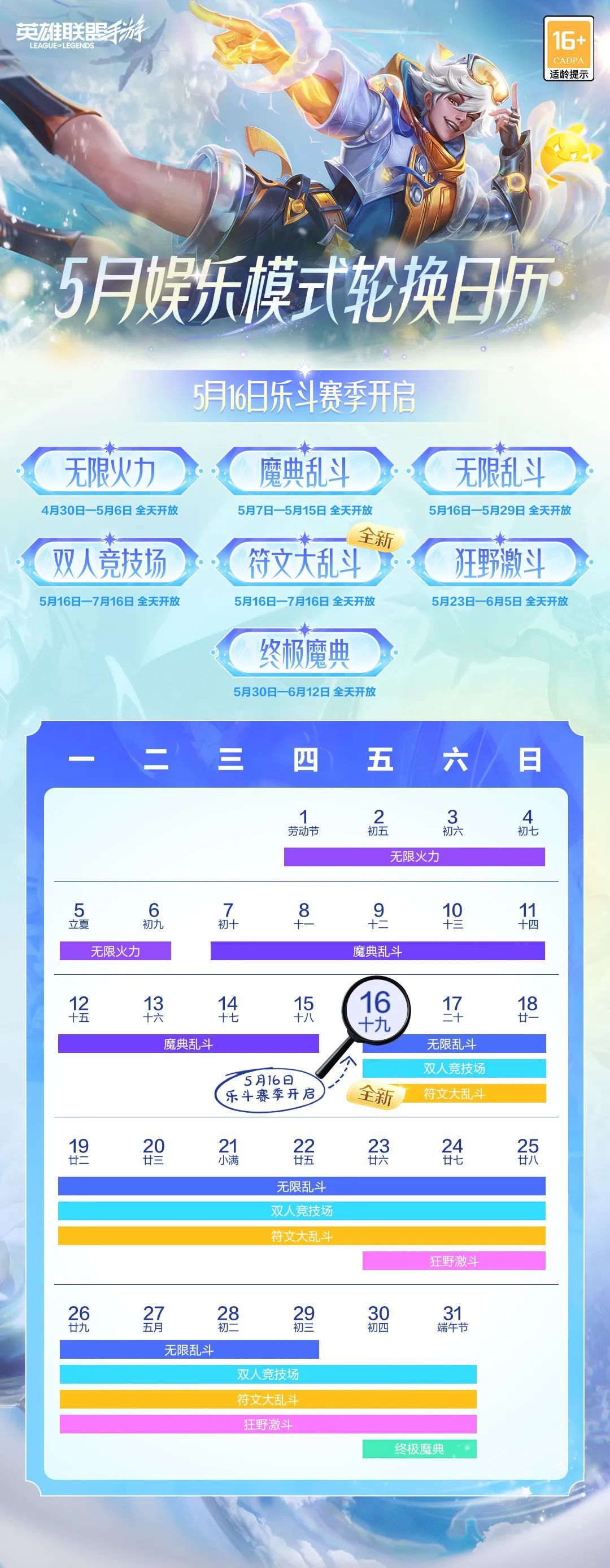 5月娱乐模式轮换日历新鲜出炉!魔典乱斗、无限乱斗等多个娱乐模式即将轮换上线。乐斗赛季将于5月16日开启,更有大家期待的全新符文大乱斗娱乐模式同步来袭!快约上好友,在不同娱乐模式里畅享峡谷欢乐吧~