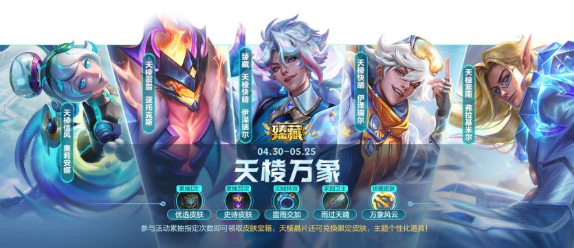 截止至5月25日,召唤师可以通过参与“天棱万象”活动获取天棱震雷 亚托克斯、天棱快晴 伊泽瑞尔、天棱信风 奥莉安娜、天棱寒雨 弗拉基米尔、臻藏 天棱快晴 伊泽瑞尔新皮肤。