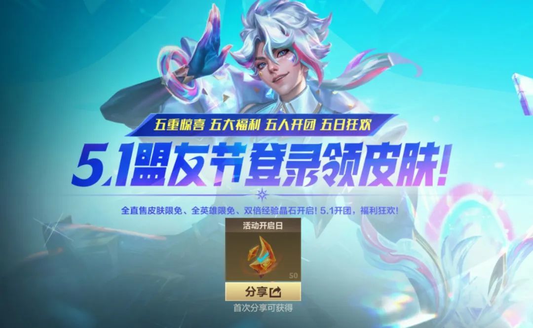 5.1盟友节来啦!五重惊喜,五大福利,开启五日狂欢!登录就能领史诗皮肤,还有全直售皮肤限免、全英雄限免、双倍蓝色晶石+双倍经验等超多福利。快喊上开黑好友,今日上号一起在峡谷畅享福利盛宴,尽情嗨玩~