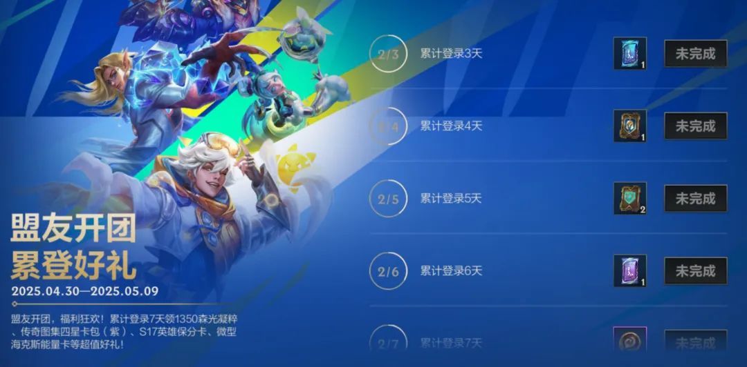 截止至5月9日23:59,召唤师累计登录7天即可领取对应的森光凝粹*1350(相当于时空探索20抽)、传奇图集四星卡包(紫)、S17英雄保分卡、微型海克斯能量卡等超值好礼!