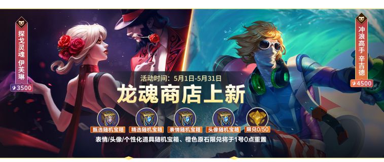5月龙魂商店轮换上新!召唤师可用龙魂水晶*3500兑换探戈灵魂 伊芙琳和龙魂水晶*4500兑换冲浪高手 辛吉德,同时还有新一轮的橙色原石*50可供兑换噢~