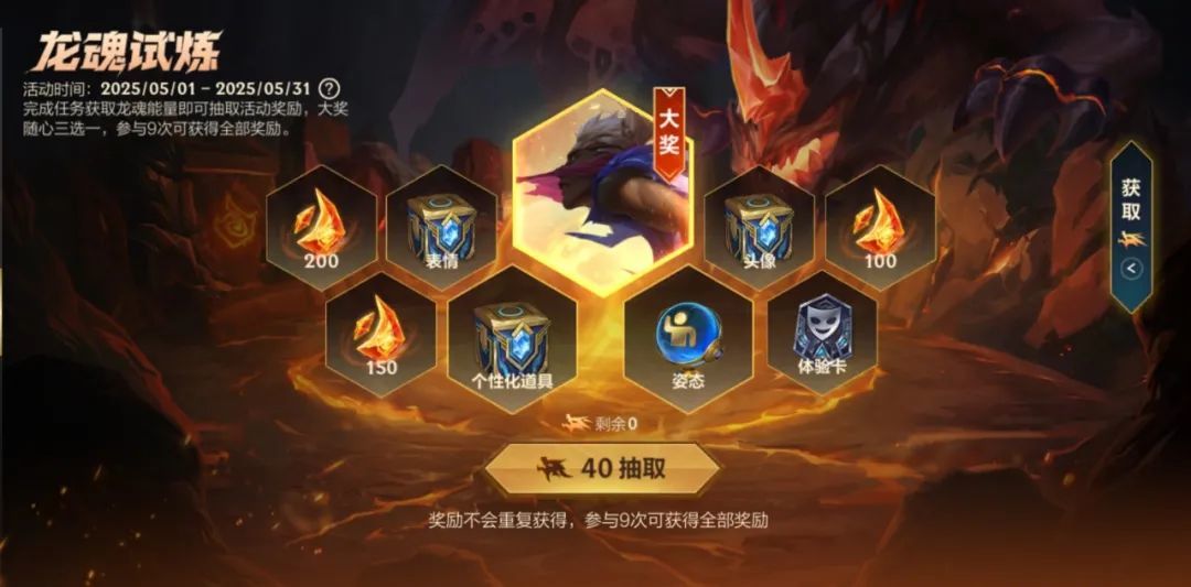 5月龙魂试炼阶段一今日开启!截止至5月31日,召唤师完成对应阶段任务,即可实现时之砂 艾克、龙魂水晶*3000及专属大奖随心三选一!