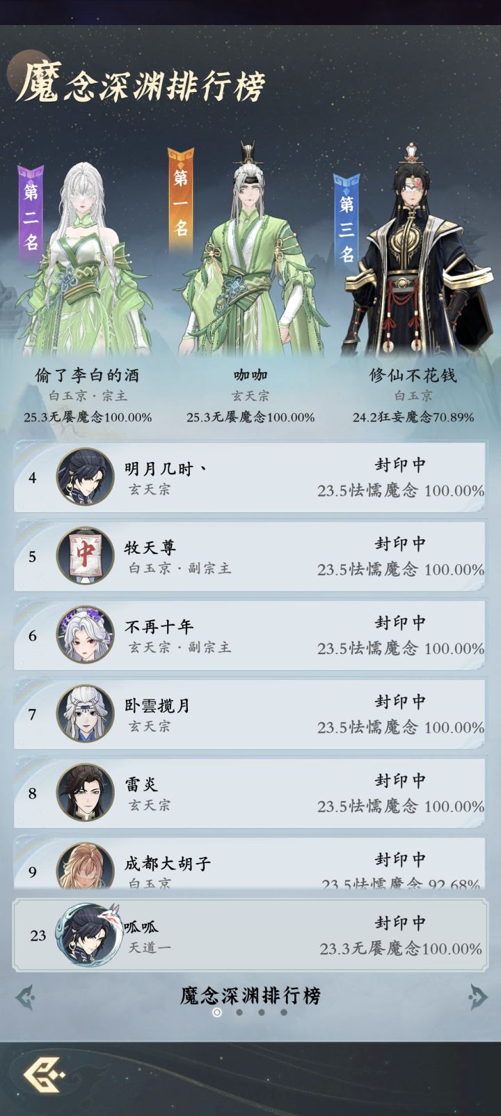 紧随其后的是白玉京的宗主“偷了李白的酒”,同样是 25.3 的无餍魔念和 100.00%的占比,和咖咖不相上下。这名字就透着一股潇洒不羁,仿佛真的偷了诗仙的酒,带着几分仙气和侠气。他和咖咖之间的竞争,就像武侠小说里的两大高手对决,难分伯仲,不知道下一次排行榜更新,谁会更胜一筹呢?