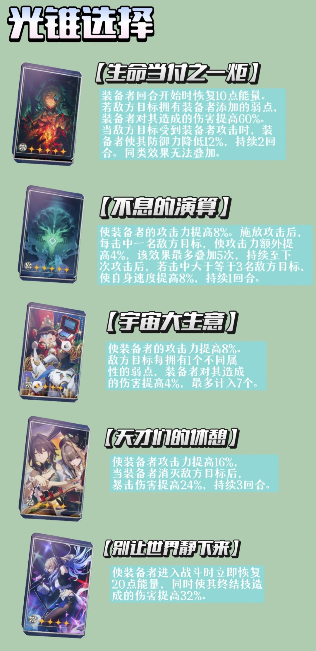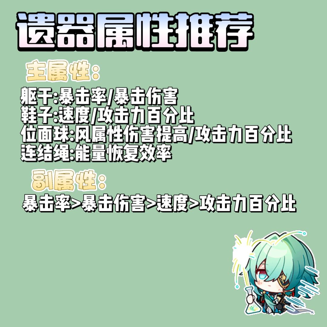 ③【死水深潜的先驱】四件套:暴击率提高4%,装备者对陷入不少于2/3个负面效果的敌方目标造成的暴击伤害提高8%/12%。装备者对敌方目标施加负面效果后,上述效果提高100%,持续1回合。➕【生命的翁瓦克】二件套:使装备者的能量恢复效率提高5%。当装备者的速度大于等于120时,进入战斗时立刻使行动提前40%。