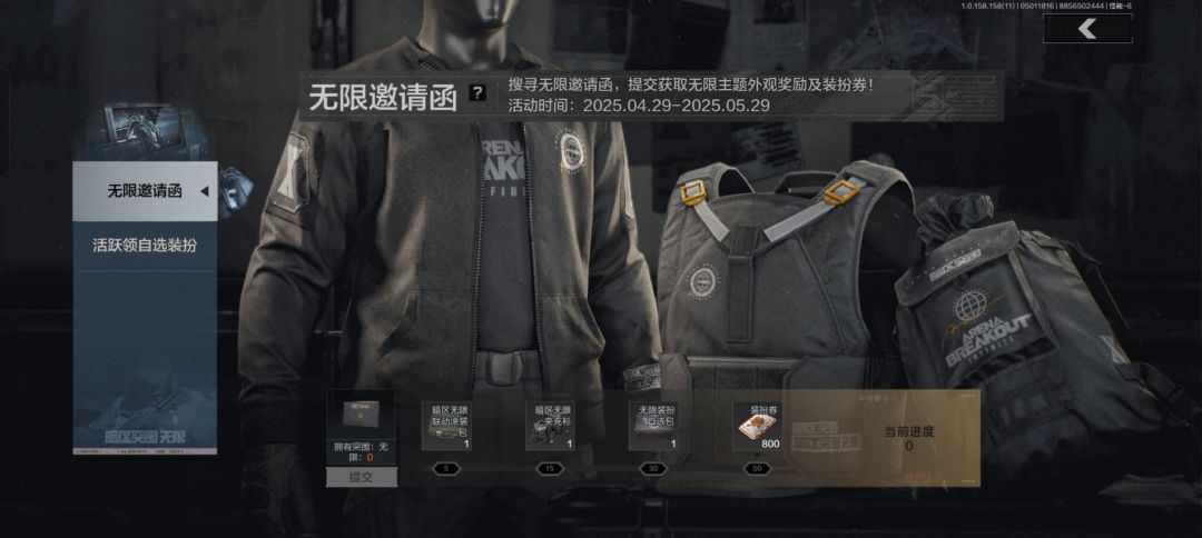 活动奖励:暗区无限·夹克衫、暗区无限·KN突击防弹衣、暗区无限·老旧口袋背包、无限装扮自选包、柯恩币随机礼包(最高58888柯恩币)