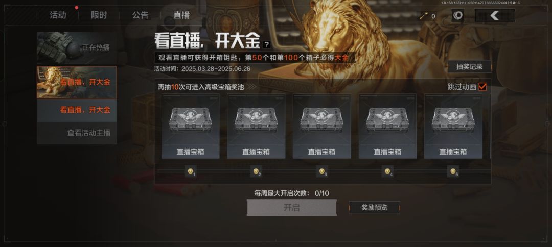 校尉忠告:每周最多可开启10个宝箱,之前没参与过的小伙伴现在开始也只是能开满50个拿大金的,千万别再错过啦!