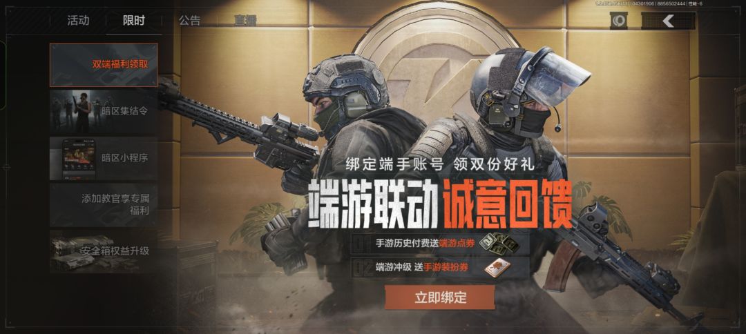 活动界面完成账号绑定领双端六格安全箱体验卡,手游玩家有机会领端游百万柯恩币、端游点券、限定名片&头衔!一步到位!