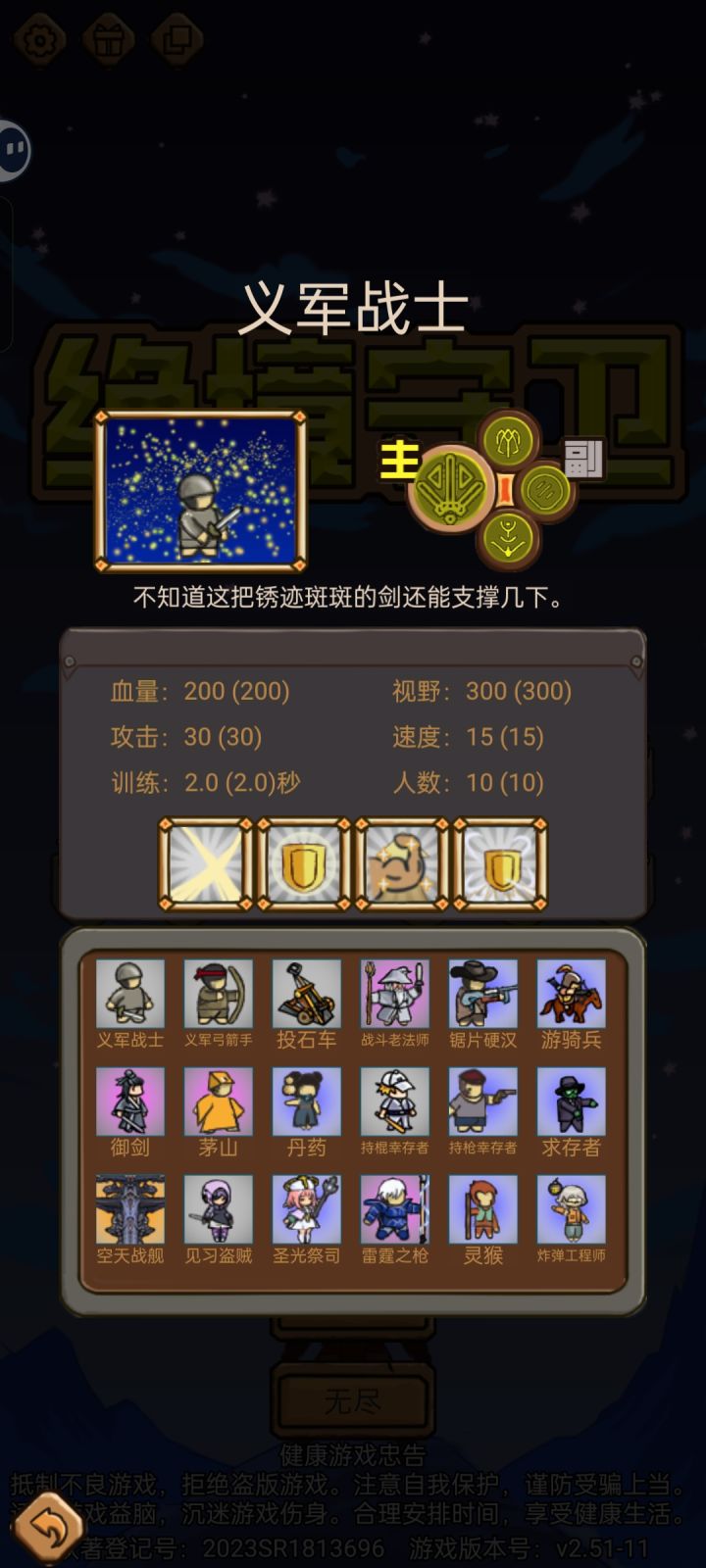 后期的难后期的难点主要是在怪物高攻高防高刷新开局实在是太难开了,被打自闭了怎么办?那就只能想办法,怎么强行破开防御把怪弄死,尽量让他少攻击,那他的伤害不就低了🤓以此引来了我们的第1个符文,也就是核心符文激怒 Lv 4,被攻击时增加攻击160,状态持续5秒😋什么你说五秒之后怎么办?😨有没有一种可能,兵种都活不到5秒。🤓然后又有人要问了。那你兵种血量这么少,300 200的,对面一碰就死了怎么办?这还输出个蛋😨,由此引来了我们的第2个符文护盾 Lv 4增加一次性200点生命值的护盾🤓容易死,那就增加生命,多扛两下,多输出一点是一点😋这两个就是前排核心符文。然后又有人问了,那我训练时间这么长怎么办?😨输出还是不够怎么办?😨那你就可以凭借着你的缺陷去调配训练,双生和狂怒符文,分别是减少训练时间,创造分身和受到攻击增加攻速。🤓然后这个时候又有人要问了,难道我们不需要后排吗?🤔我只能说。可以有。特别是第7关会有三个精英狐狸狐狸max这个时候我们就可以搭配一点后排。比如说弓箭手之类的攻击次数多的搭配上眩晕符文无线控精英怪,不控的话,高攻高防还是群伤蒸鹅心😨这个时候把他控住就非常好。其他前排兵种去清小怪直到黄条结束,小怪停止刷新,然后集火把他们三沙了😋😋文明的话,这个模式自动锁死铸剑阁,运气差点可以带出击大厅,运气好点,可以替换成最后的炸药指挥中心啥的。第2个图就是我的配兵