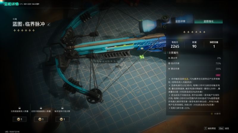 临界脉冲的面板自带2%的暴击率,70%的弱点伤害和28%暴击伤害。但是电弩是一把元素武器,这些物理加成其实并没有那么重要,主要还强度还是看武器特性。如图↓