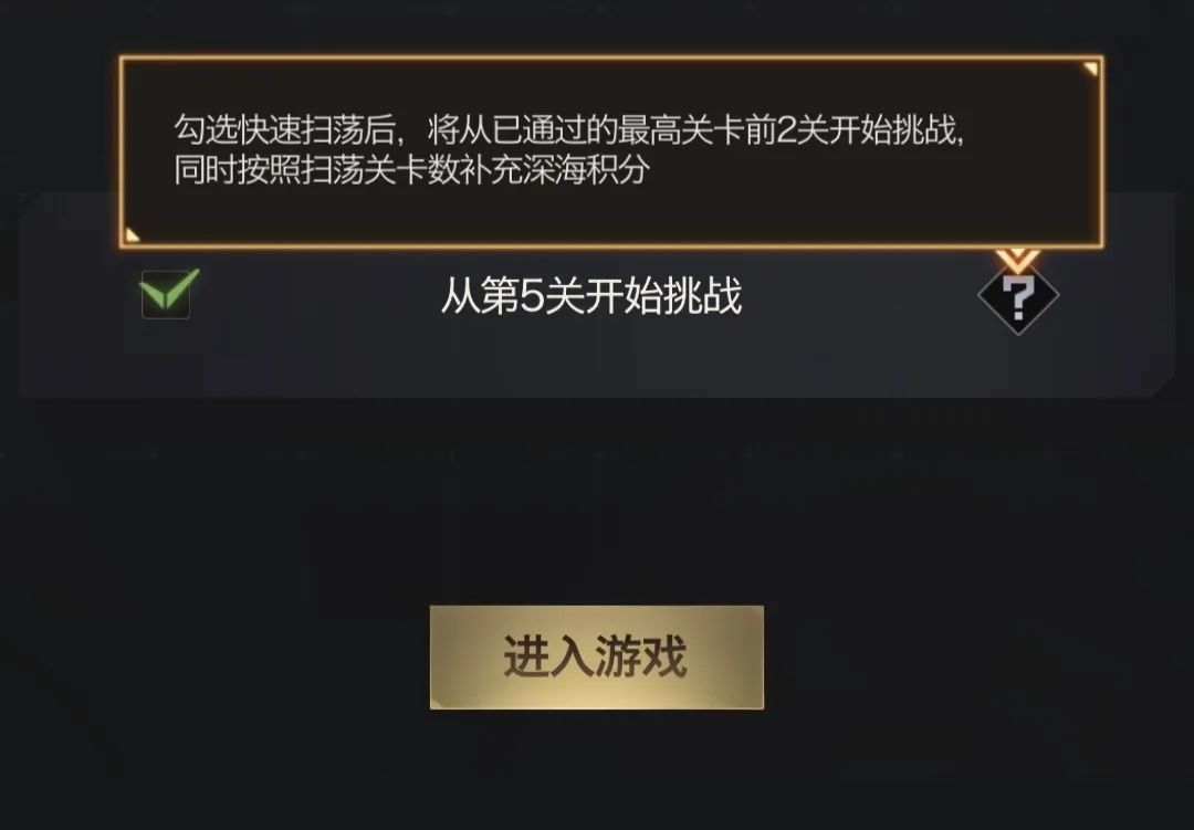 活动有扫荡功能,扫荡时玩家将从本期活动中通过的最高关卡的前2关开始挑战,比如目前打到第7关,那么就会从第5关开始挑战。扫荡时,根据玩家扫荡的关卡数添加初始的深海积分。