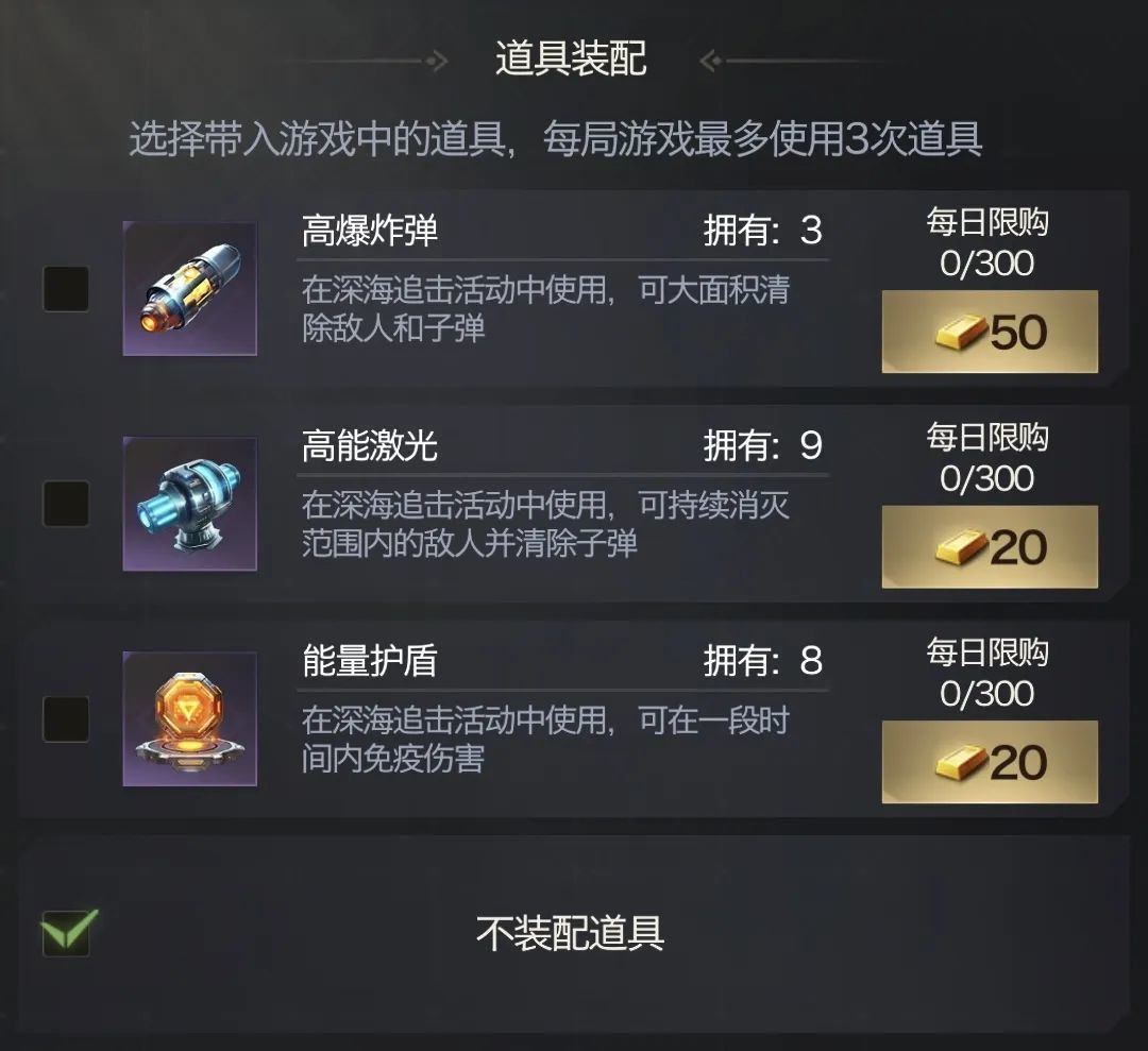 一、建议都把升级版战令开一下,不仅提高经验获取,每日任务奖励,还能获取更多的可装配道具供游戏中使用,游戏道具多,拿更高分数的概率高,进场选择装配的道具,根据本关卡敌人类型和个人操作习惯带。