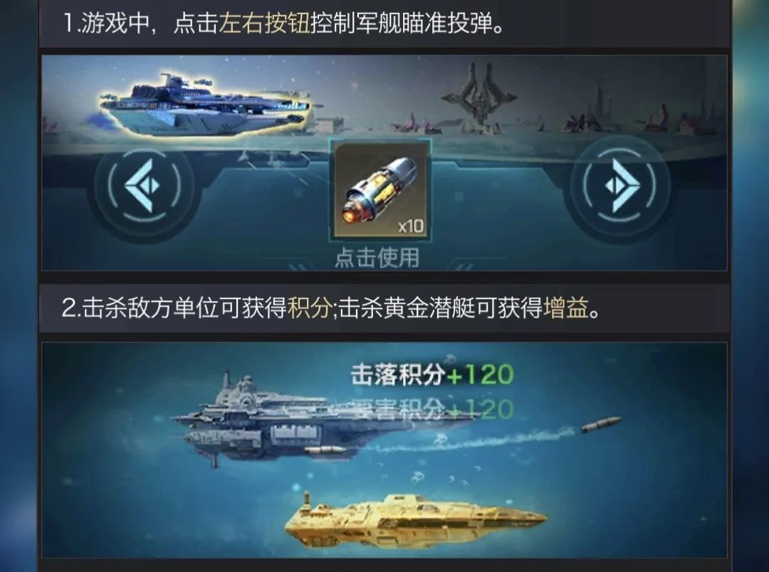 深海追击活动期间,进入游戏中,可通过左、右按钮操作军舰移动,军舰会自动投弹,子弹命中敌方潜艇或乌贼后会消灭敌人,消灭不同的敌人获得的积分不同,击杀黄金潜艇还可获得增益buff。