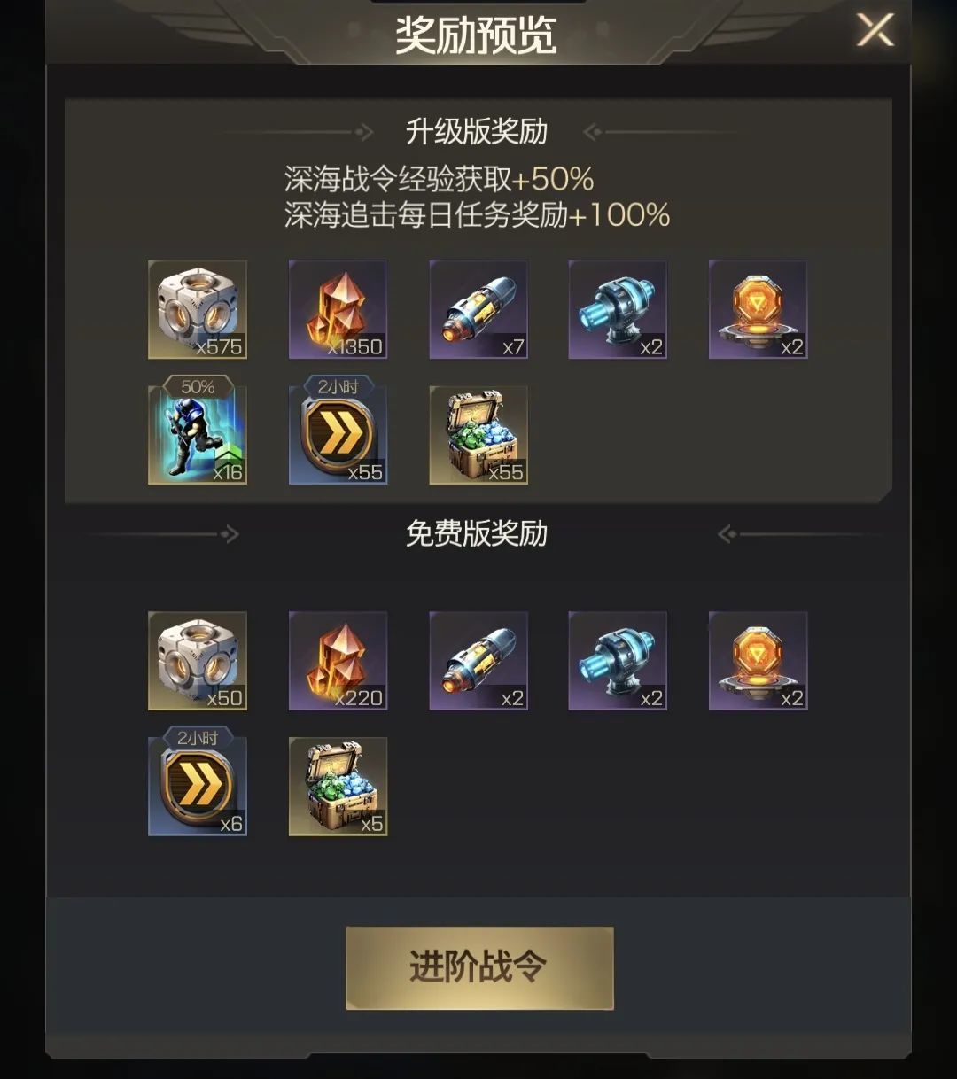深海追击活动期间,可通过进行深海追击活动提升战令等级,该等级在活动结束后重置,达到相应的战令等级可获得奖励,解锁升级版战令可获得更丰厚的奖励,可以提升战令经验获取速度,同时解锁战令后深海追击的每日任务奖励可双倍领取。