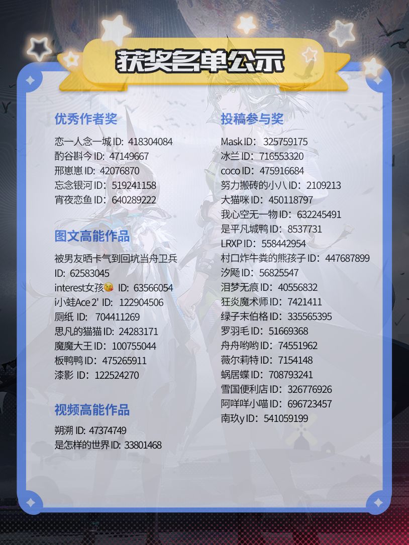 活动期间,投稿有效投稿作品≥2,综合考虑质量和数据维度,选出TOP1-5的优秀作者分别获得【明日方舟 Gift+系列 阿米娅 浮叠工业VER.】以及【山山兔毛绒玩偶-中号博士VER.】各一份