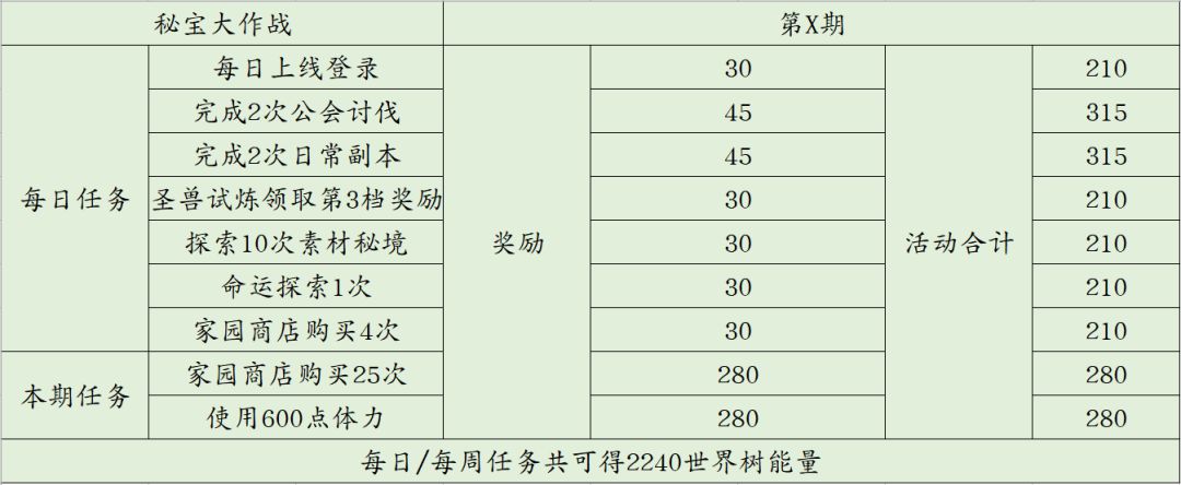 秘宝大作战是在服务器开启的第八天上线,每周刷新一次的周期活动。每期活动可以通过完成任务或购买礼包获得世界树能量,活动结束时未消耗的世界树能量可以在下一期活动使用哦! 建议在能拿到一个5级封印宝藏的情况下,再投入世界树能量解锁宝藏。