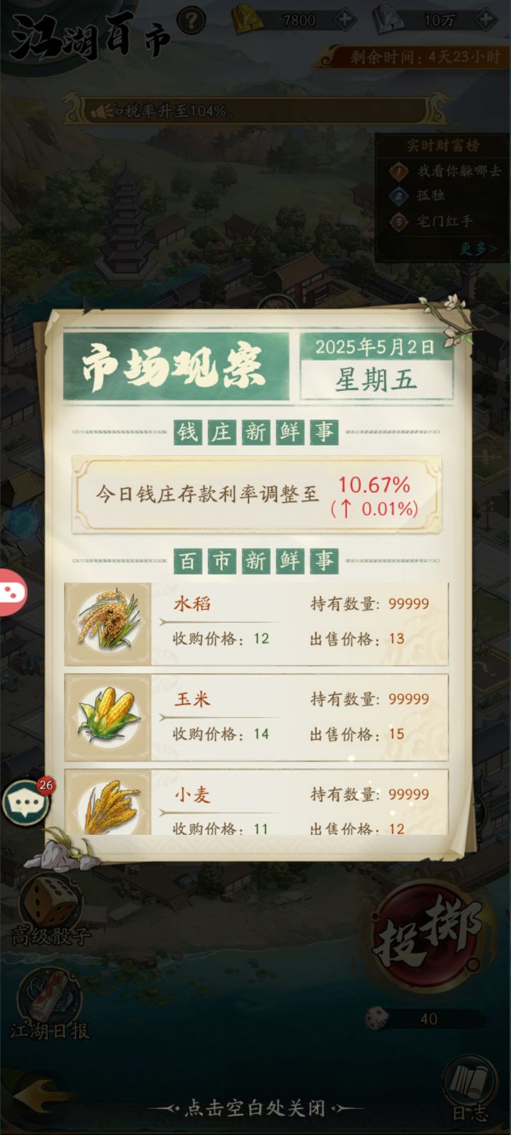 今天是5月2号,上图就是我昨天屯的物资,昨天分析的粮食会上涨,今天果然涨了10%左右,铁反倒跌了两个点,幸运的是昨天我觉得快打仗了,就屯了不到2万的弓箭,因为昨天弓箭便宜