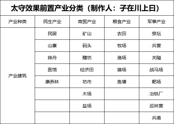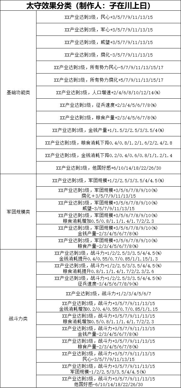 本次打算根据太守效果的前置产业与效果进行初步的分类,仅考虑三级建筑(拥有7级建筑太守效果的名臣较少,且效果大多比较一般~)