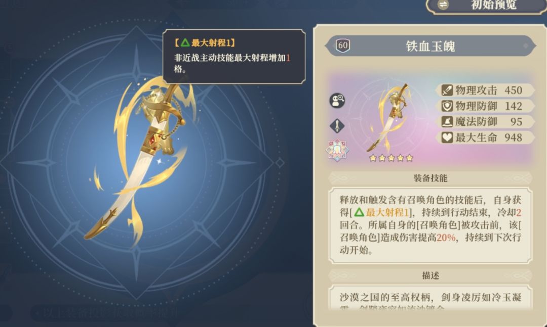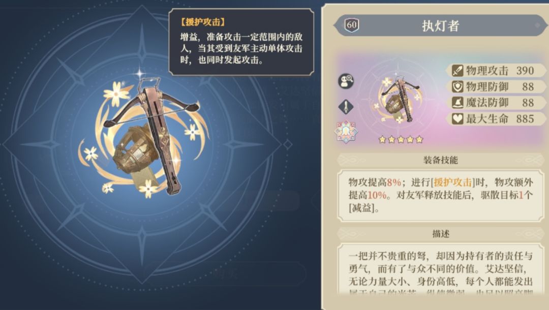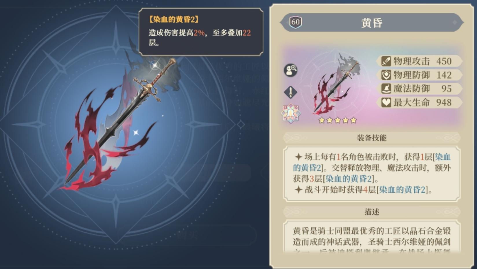 最好用的单手剑之一,不论是10%属性加持还是debuff驱散都很常用,长夜的15%伤害加成也非常强悍,但是只有5星才能有长夜2的增益。所以搞一把5星很重要。