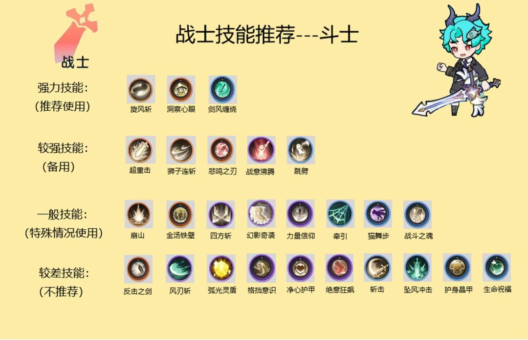 在技能抽卡理想的前提下,战士技能携带建议(主动技能按顺序排列):
