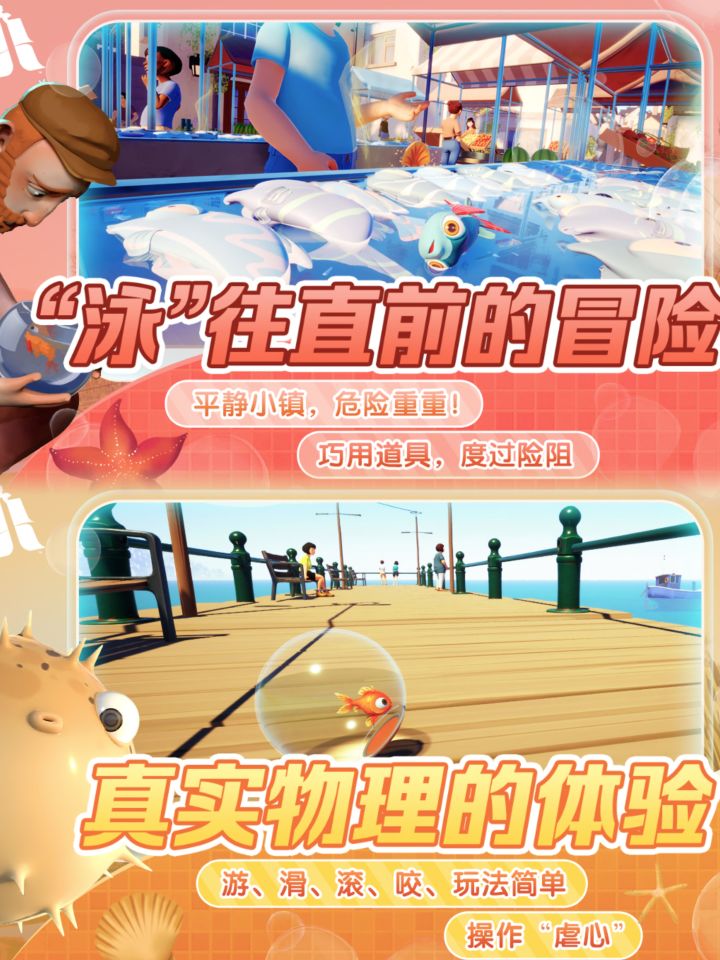 ✨游戏中,四条在宠物店鱼缸里长大的小鱼儿🐟被迫分离,你将操控它们在伯纳德郡开启冒险,通过游动、翻滚、滑翔、啃咬等动作完成挑战💪,最终在温暖的大海重聚。