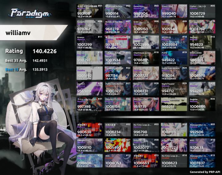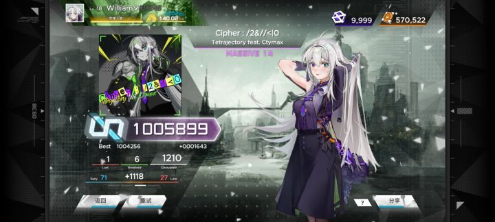 我一直有一个梦想要冲击商业音游的零氪上限,范式的这个零氪A是我在这条路上的第一个里程碑,具有重要的纪念意义。感谢范式官方在我上A的后一天就复刻了交错解码,完美的满足了我的需求。无论怎样,我都会在零氪的路上全力前行!下一阶段目标是GIGA段和rating145!(附现在b50)
