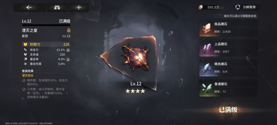 举个例子5星徽章不是0基础刷取获得,而是通过已经强化满级的4星徽章,通过消耗资源(金币,磨石),在此基础上提升为五星徽章,各个强化的副词条根据4星徽章强化提升的比例获得相应提升。