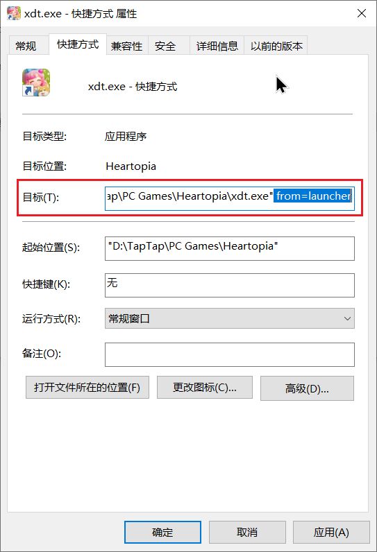 然后会跳出快捷方式的属性设置界面,我们在目标一栏的尾部打一个空格,然后输入from=launcher