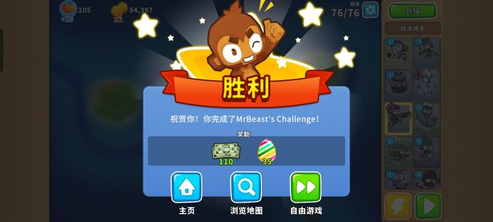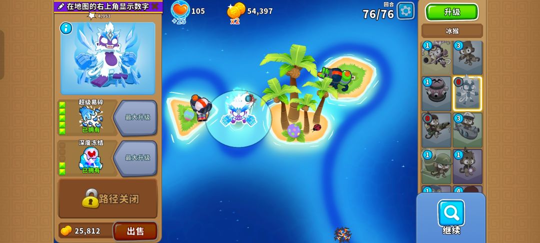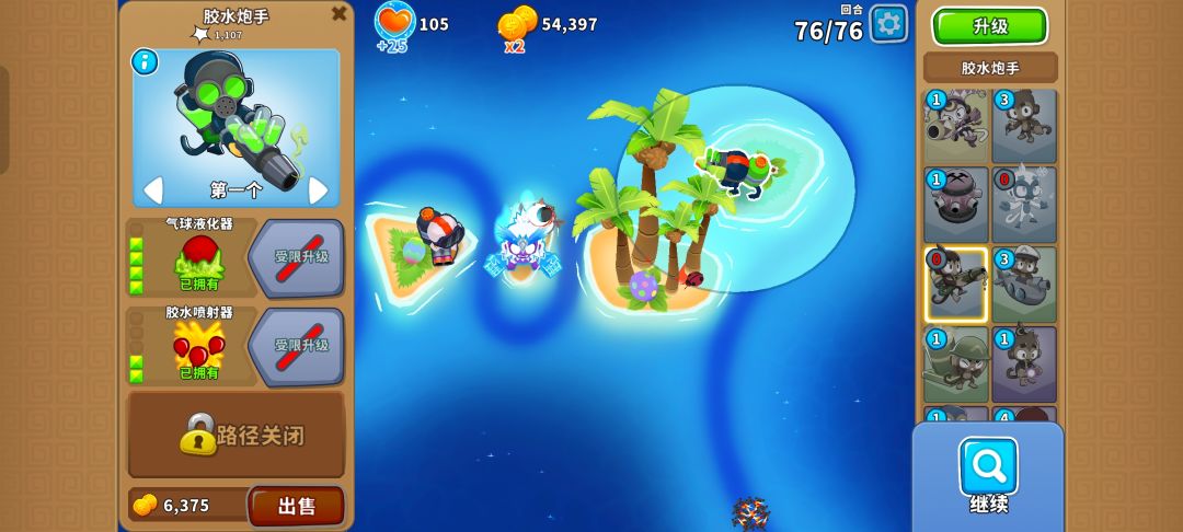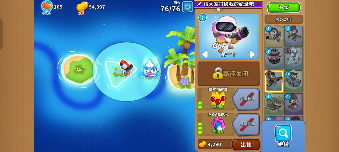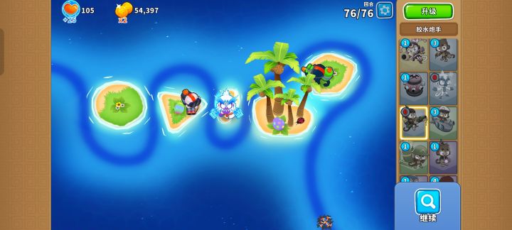 但只要在中间的小岛放下520冰猴,三角形的岛放下023胶水泡手来减速,最右边的岛上放下420胶水泡手清理剩下的气球就行了。