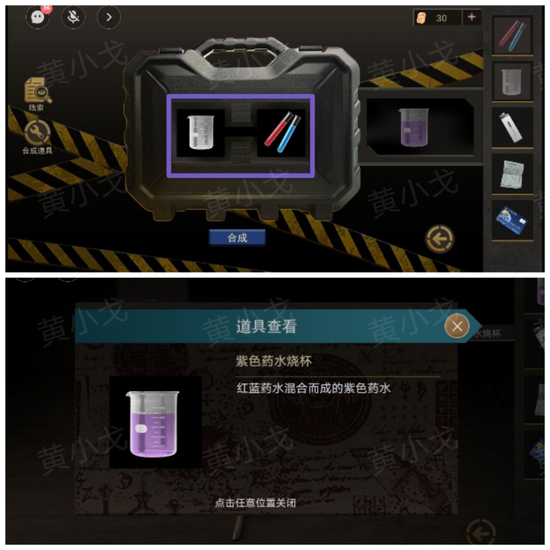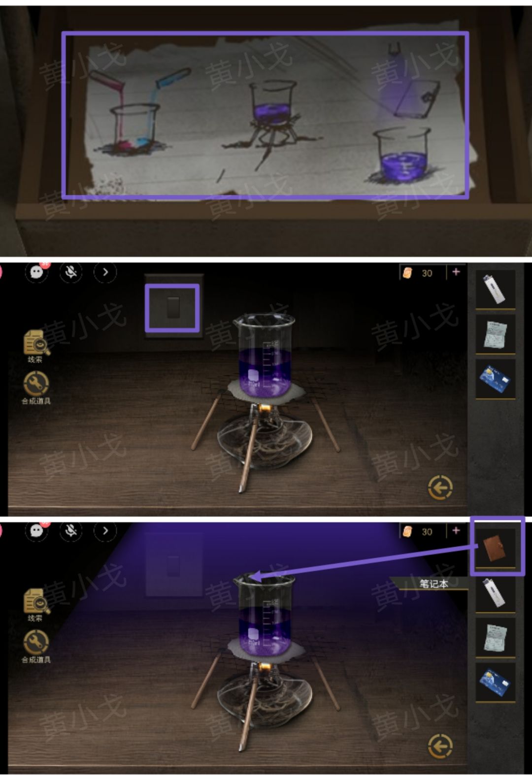 21.根据纸条上的线索,按下紫灯开关,把【笔记本】放入烧杯