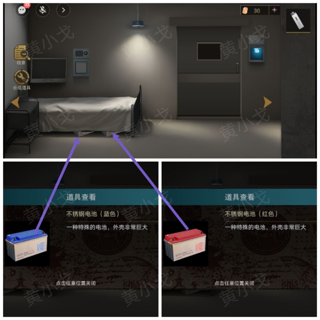 1.拾取床底的【不锈钢电池(蓝色)】和【不锈钢电池(红色)】