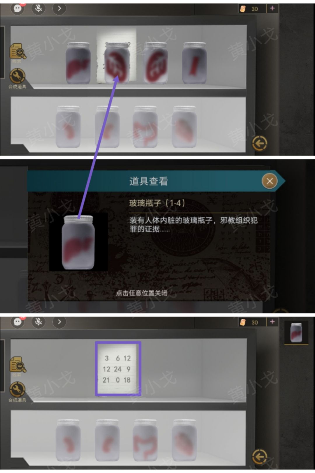 11.打开上层储物柜,获得【玻璃瓶子(1-4)】,纸条上的线索要告诉队友