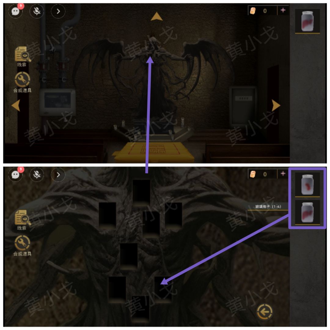 13.点击邪神雕像身上的空洞,放入【玻璃瓶子(1-4)】和【玻璃瓶子(5-8)】