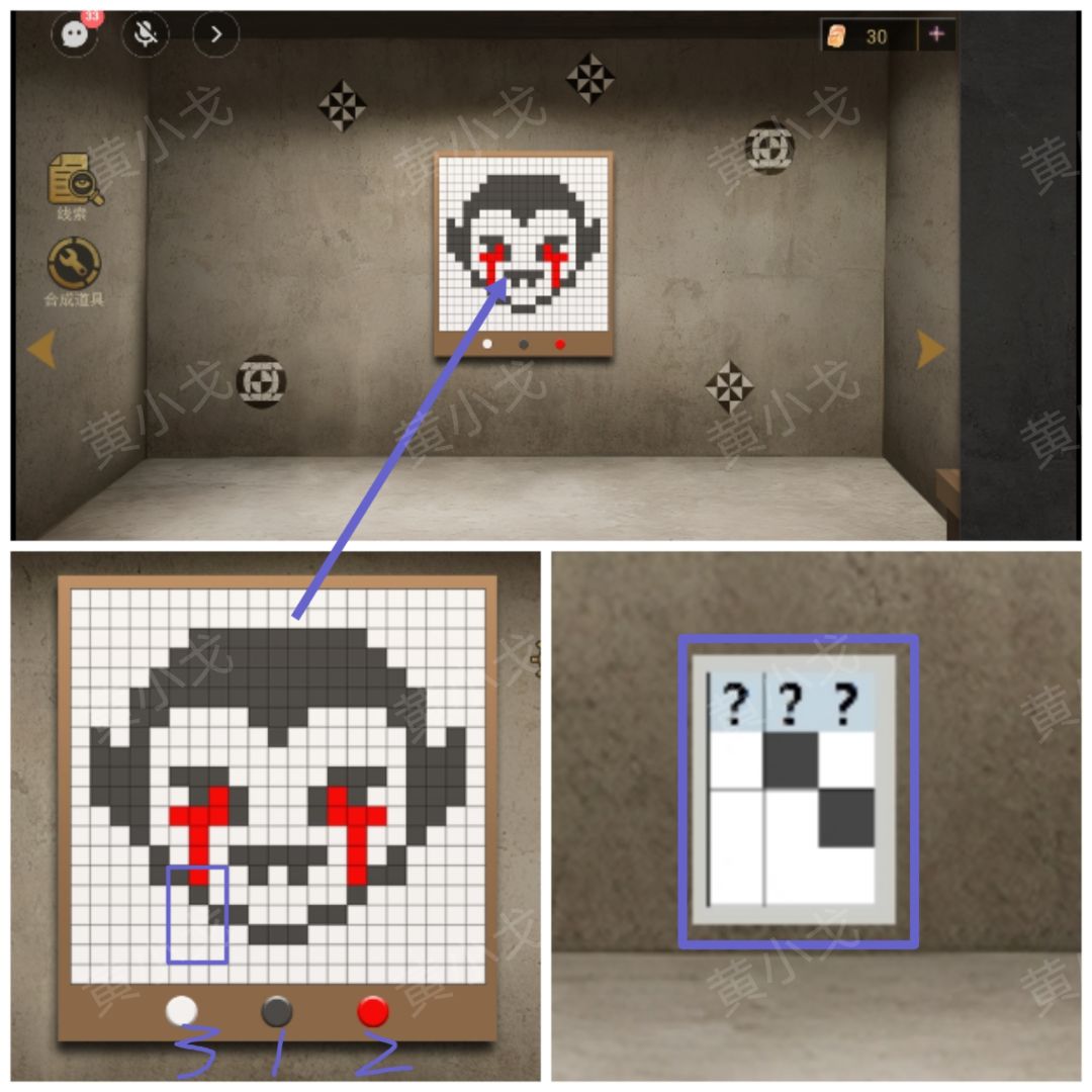 1.点击墙上的像素画谜题,根据身后墙上的提示,找出对应的位置,然后按顺序按下按钮
