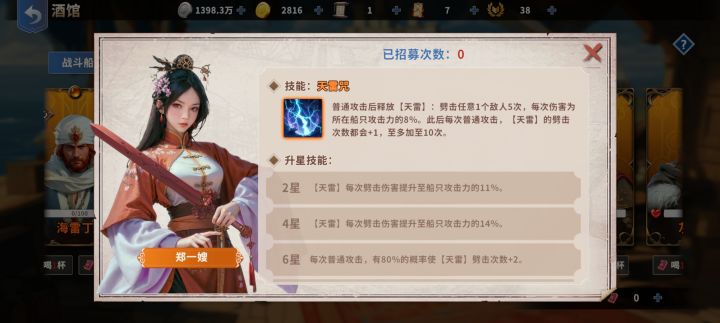 再说培养,郑一嫂是个后期发力的船长,低星不建议意直接上场,叠被动慢,雷击伤害低。