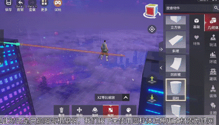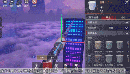 在右侧选择物件制作场景内容:用书架和立方体搭建摩天大楼框架,填充霓虹灯材质。
