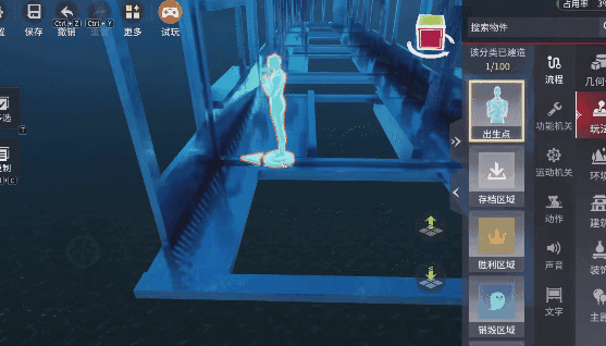 利用布置和连续复制功能制作大楼墙壁,组合物件后复制得到起点和终点大楼,设置出生点和胜利区域。