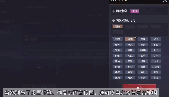 试玩满意后一键上传作品,设置标签、作品封面、宣传图,还可添加自定义背景音乐哦!