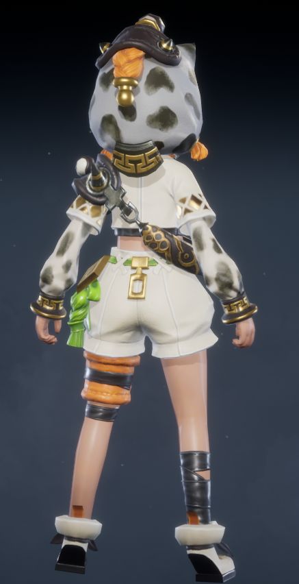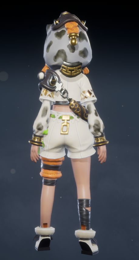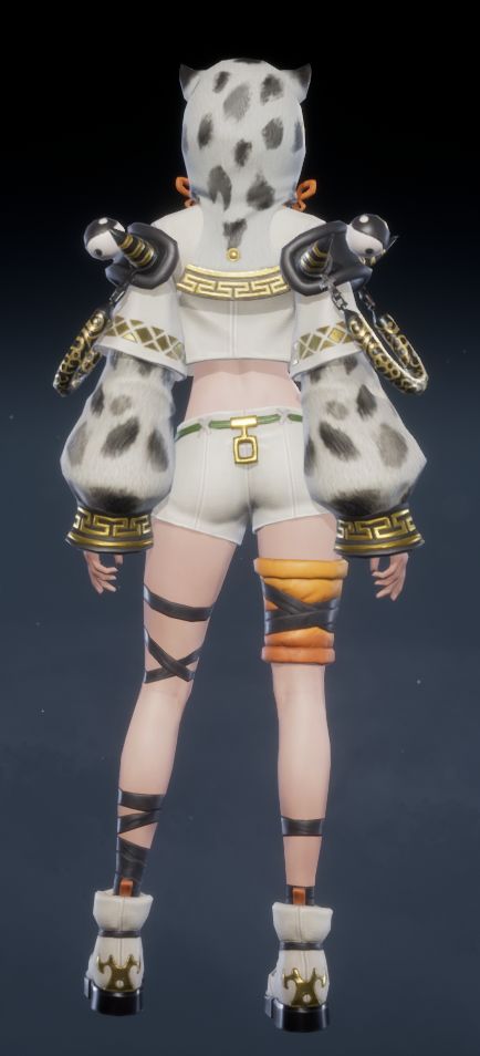 背面,圆润的猫耳兜帽后方点缀着黑色斑点,呼应整体的猫咪主题。白色短款露脐上衣搭配宽松的袖子,更显休闲舒适。不对称的腿部装饰依旧吸睛,展现出你独特又可爱的魅力!