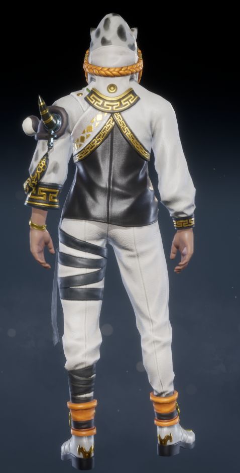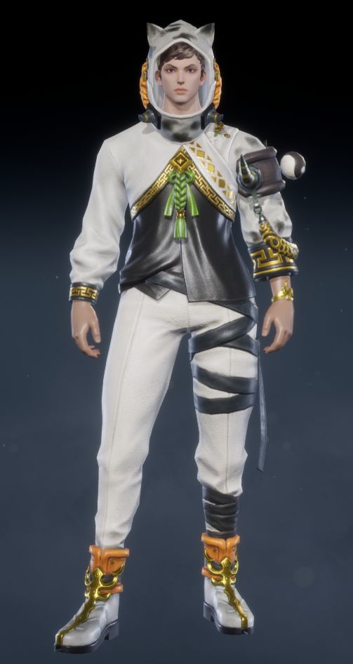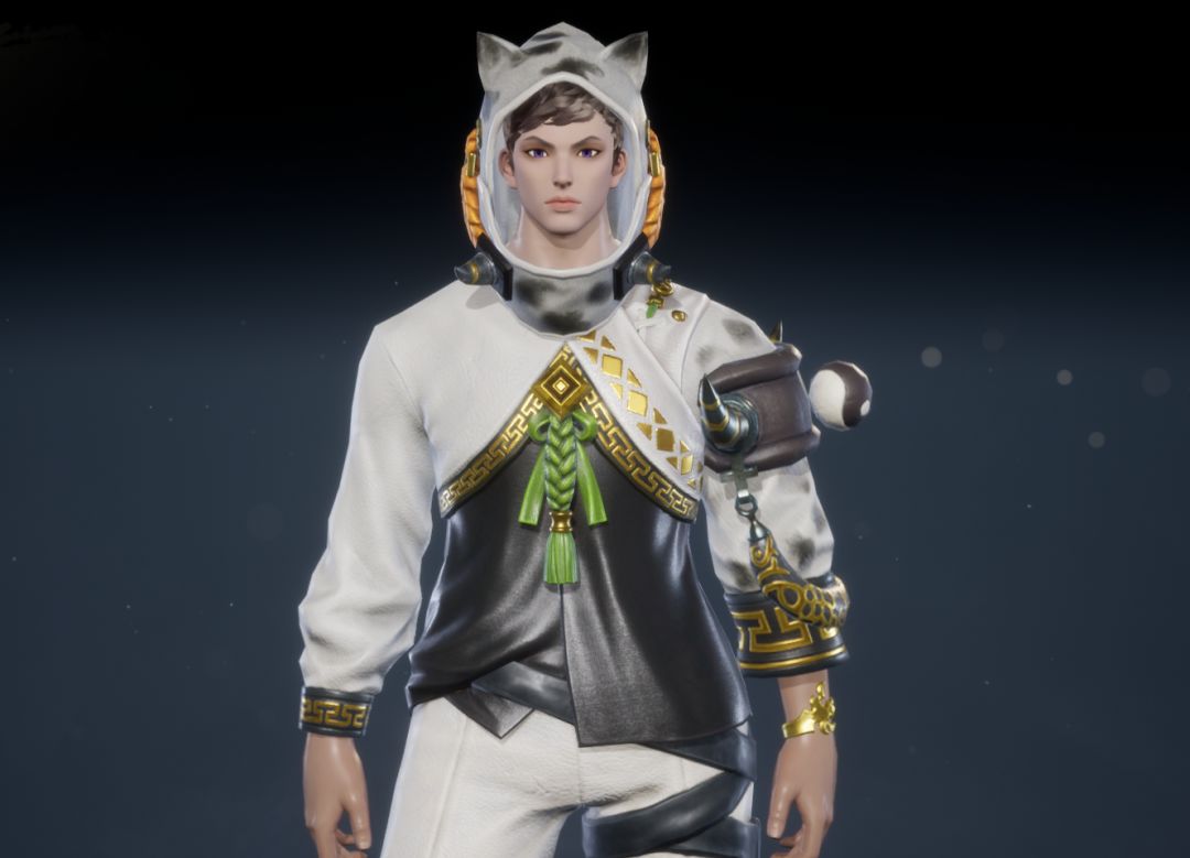 经典黑白色调,可爱猫耳兜帽与俏皮猫须,尽显男性角色的灵动个性。白色外套拼接黑色内搭,点缀精致金纹,更添时尚。白色修身长裤搭配不对称腿部装饰,潮流气息十足。