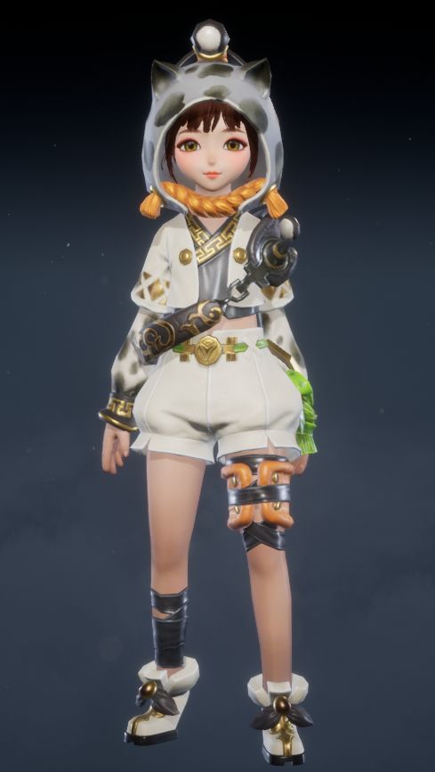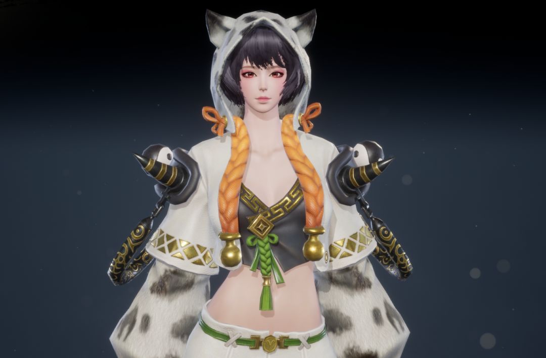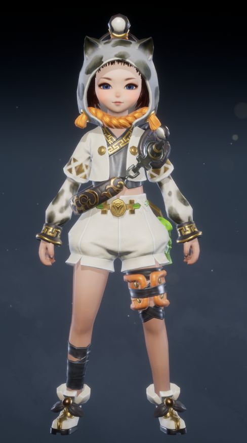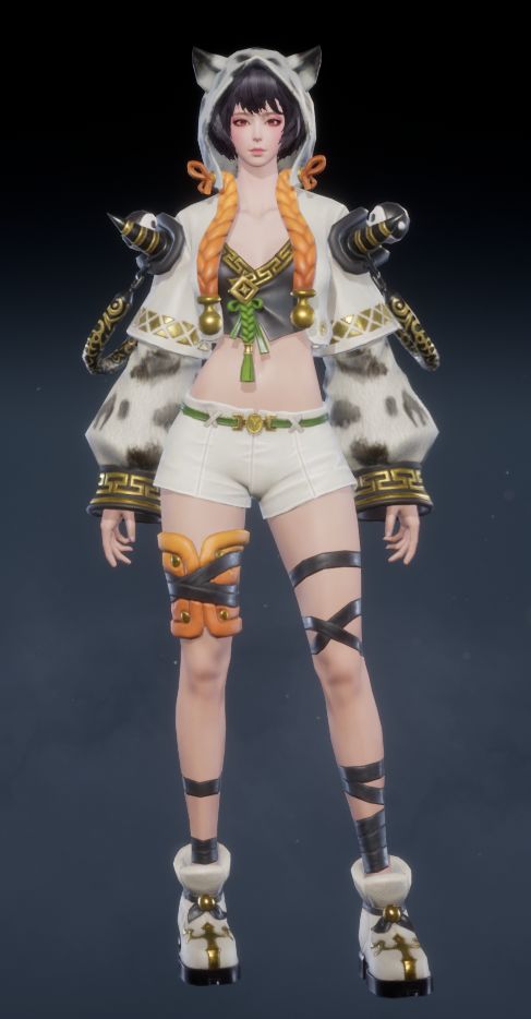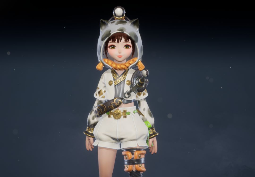 黑白主色调碰撞出潮流感,可爱的猫耳兜帽搭配俏皮的猫须设计,尽显女性角色的灵动与个性。白色短款外套点缀着精致的金色纹样,内搭的黑色露脐装束更添一丝小性感。不对称的腿部装饰,一侧是活泼的橙色绑带,另一侧是酷飒的黑色X型绑带,时尚前卫,让你成为人群中的焦点!