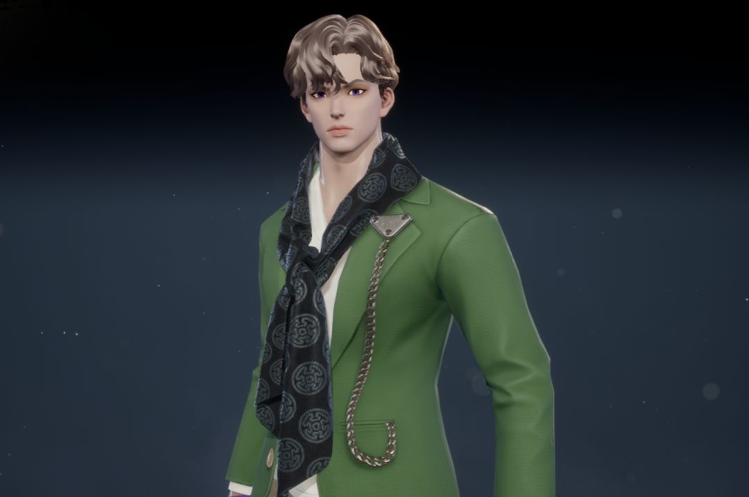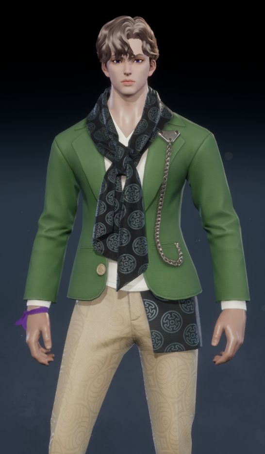 一套森林绿的休闲西服套装,内搭一件带有几何纹样的丝质围巾,衣襟间点缀着一条精致的银链,细节之处尽显品味。