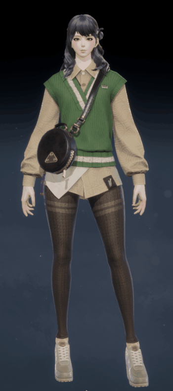 浅卡其色棉质衬衫叠搭一件清新的青绿色针织背心,腰间点缀一个黑色皮质斜挎包,利落又时尚。搭配弹力裤袜,勾勒出流畅的身体线条。无论是漫步在古镇的石板路上,还是穿梭于山间的青草地,都能让你散发出自然又率性的独特魅力。