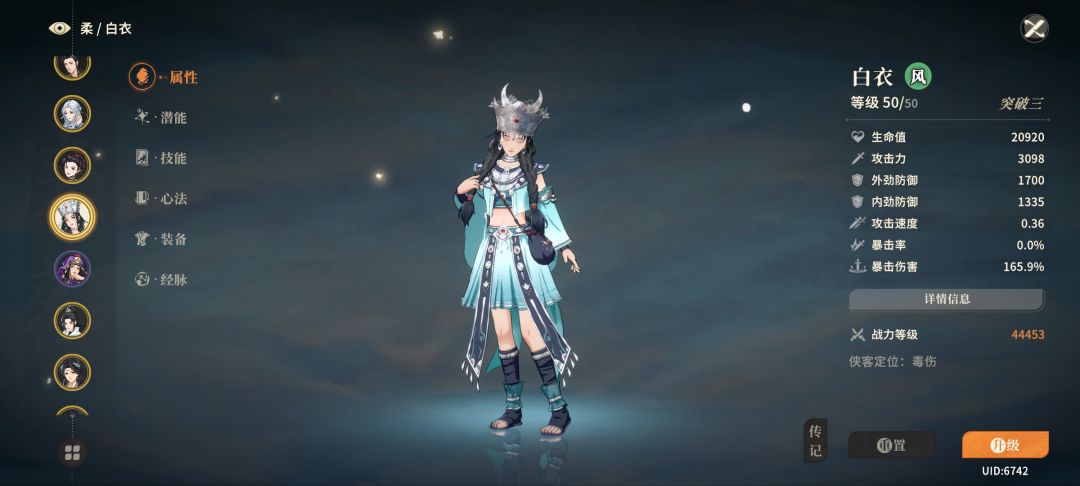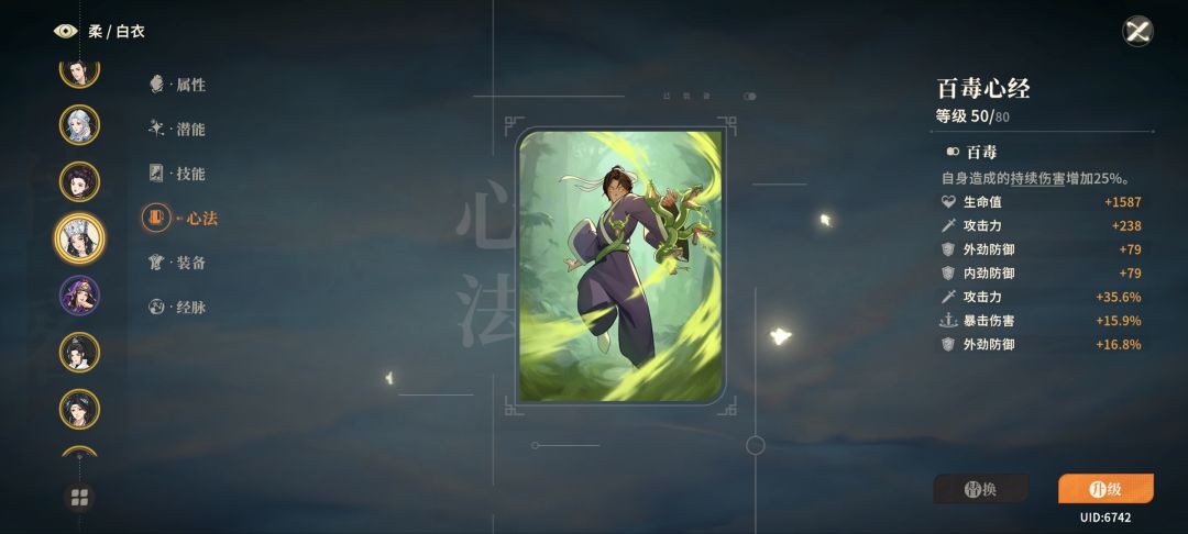 50级随着装备和经脉提升,毒伤显著提升,抽满凌雪后就抽她,3星提升较大