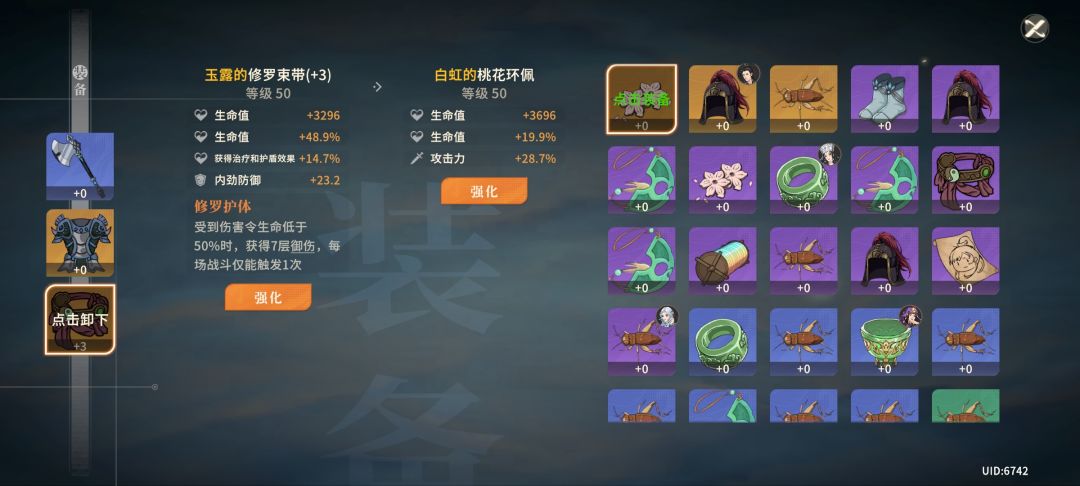 修罗腰带50%血以下7层御伤,经脉升级为强御后减伤60%