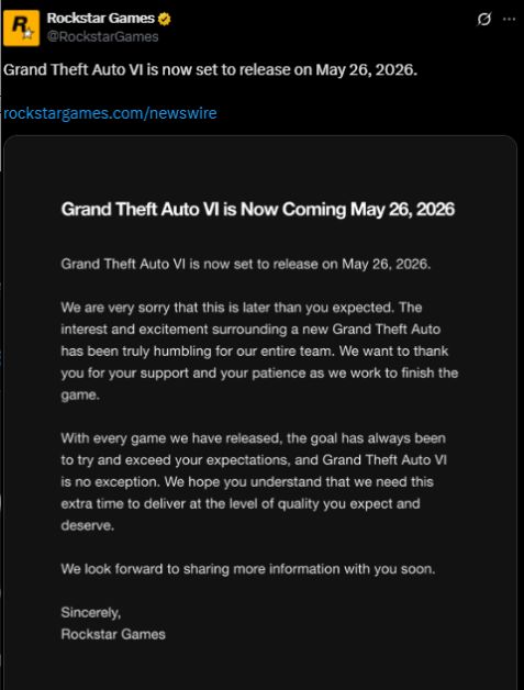 图片内容翻译:“对于此次延期,我们深表歉意。玩家们对新一代《GTA》展现的热情与期待让我们整个团队倍感荣幸。感谢您一直以来的支持与耐心等待,我们将全力完成游戏开发工作。”